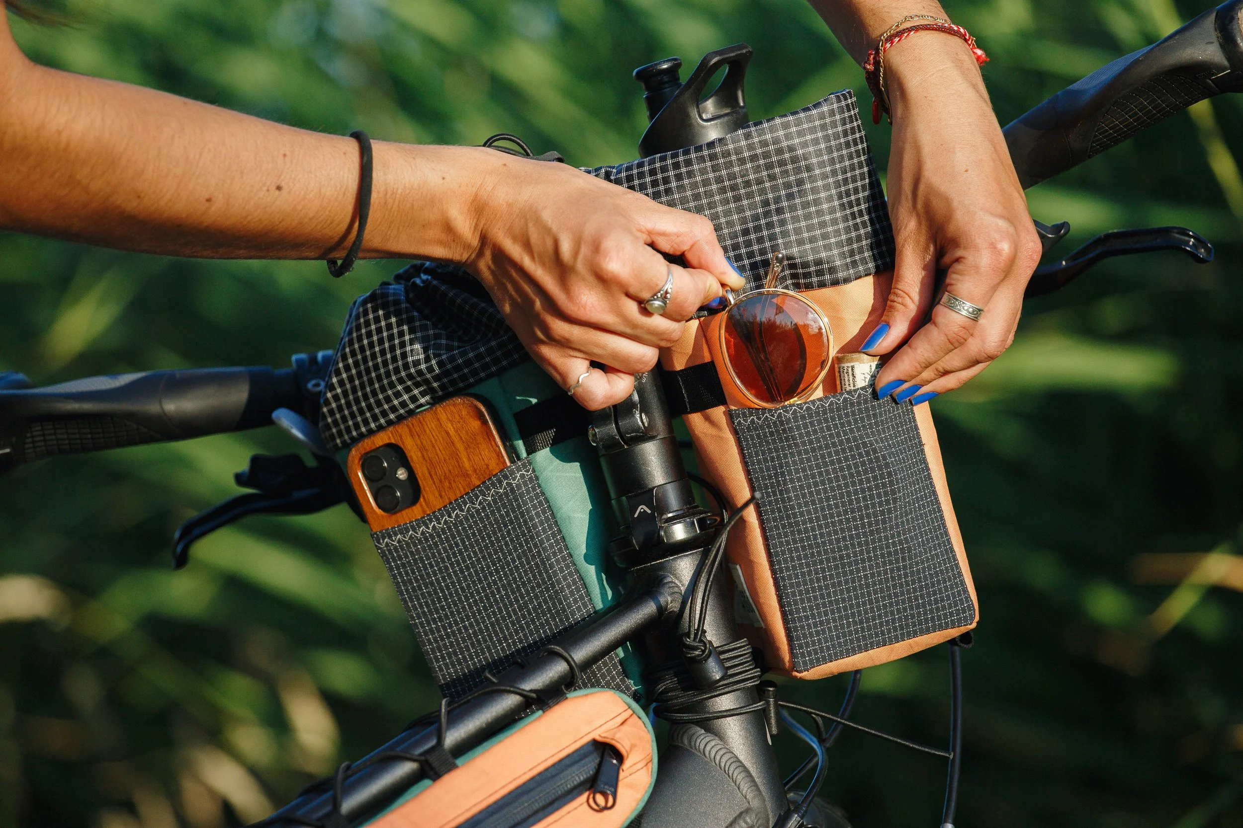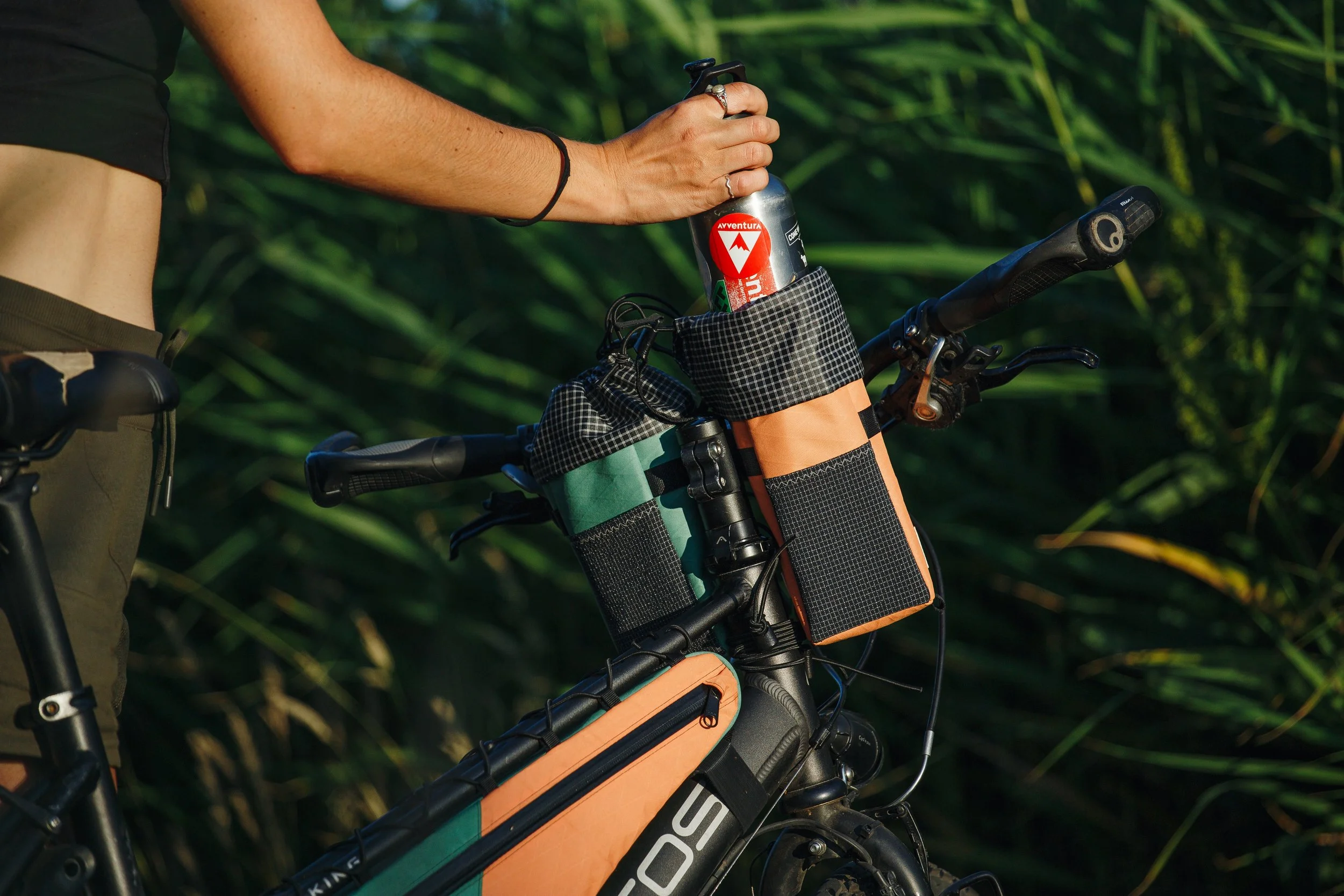 One of my personal favorite bikepacking bags is the bucket bag. These are big enough to carry a 1l Nalgene bottle, but because of the floating inside liner I also find them very useful to carry delicate stuff like fresh fruits and veggies, or other food items like a can of beans or a jar of peanut butter. Combine 2 bucket bags on the left and right side of your stem for maximum efficiency.