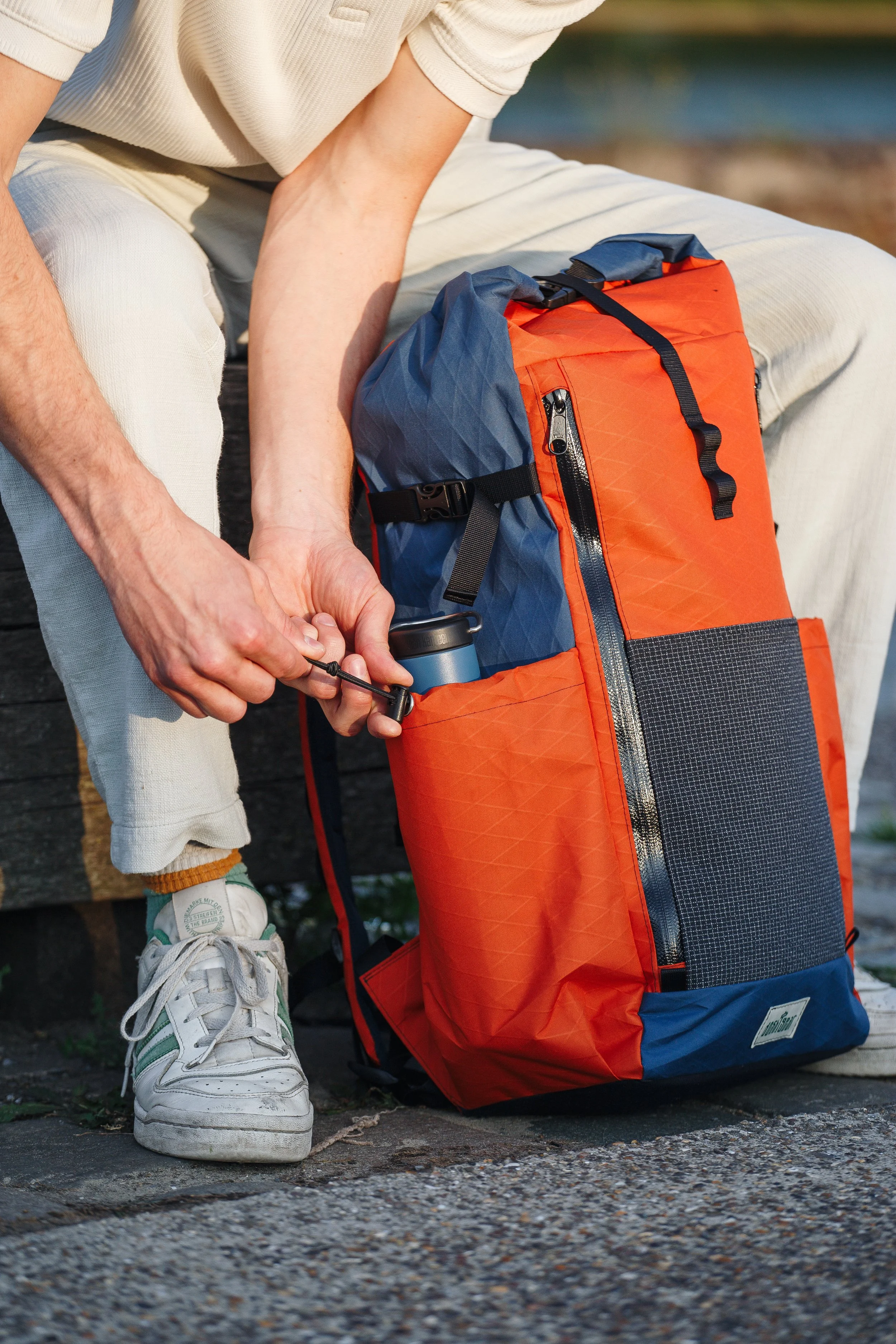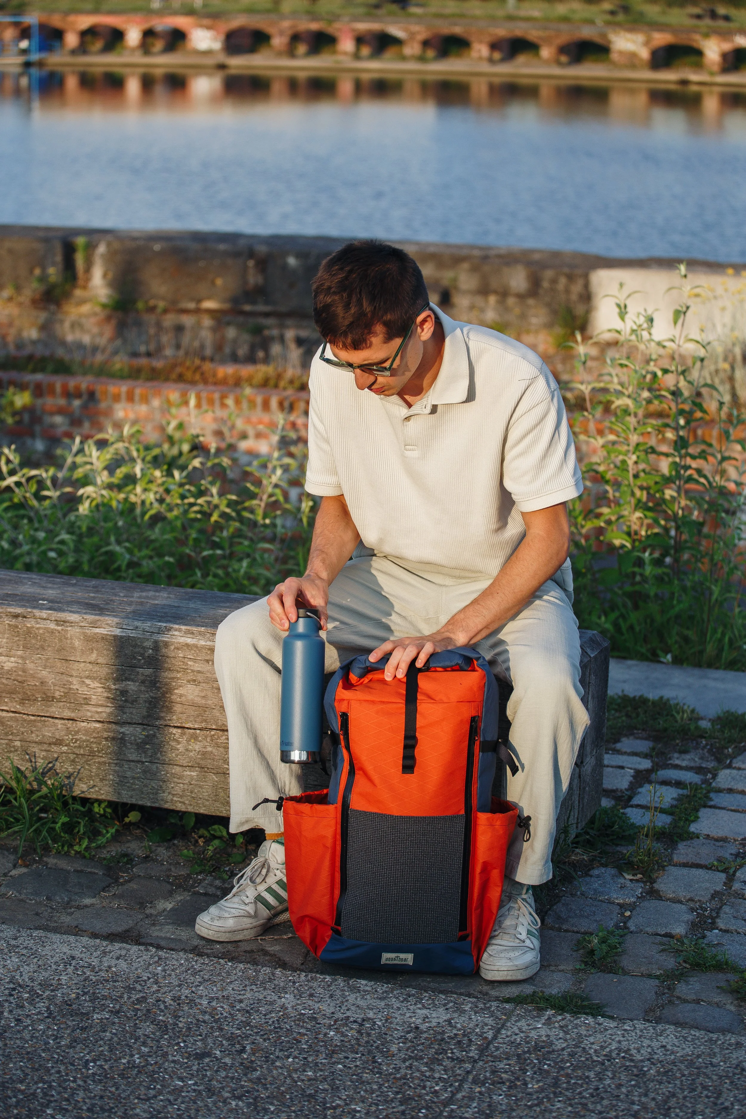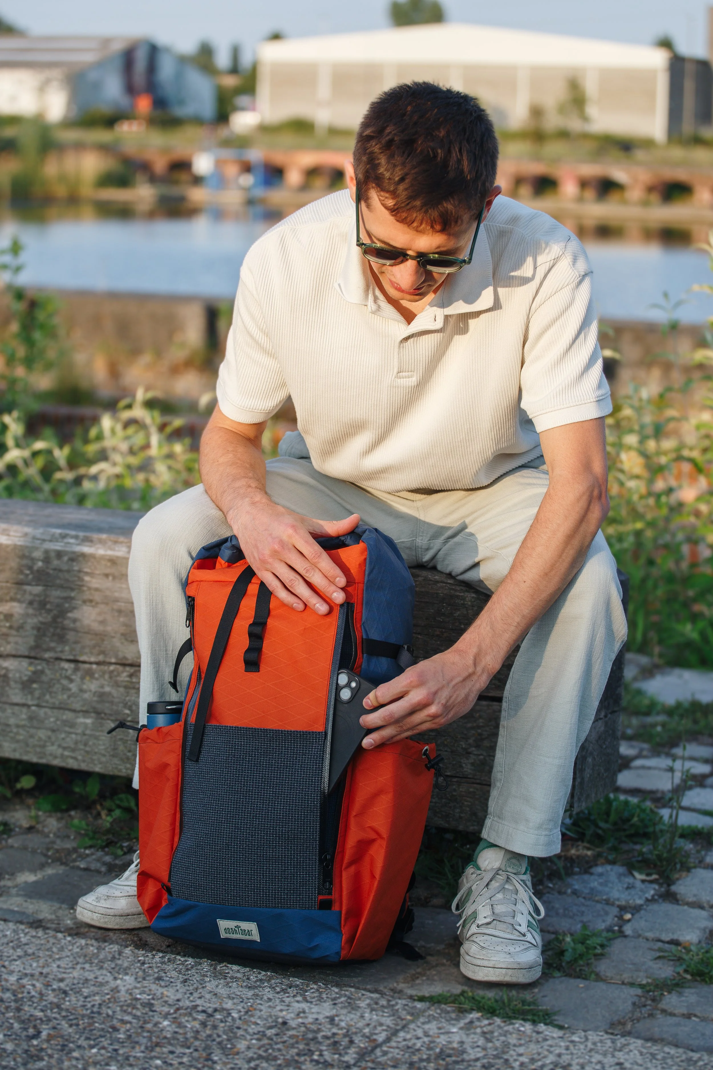 Based on the ski-touring pack, I made some improvements to the design like the addition of big side pockets to carry 1-2l bottles to make it more suitable for everyday life. The main compartment is accessed by the roll-top, or with the vertical zipper on the front of the pack. There is also another vertical zipper to access a big flat pocket. A smaller pocket on top holds stuff like sunglasses, a wallet or a pen. The chest strap and a minimal hip-belt keep this pack comfortable when you are carrying a bit more weight.