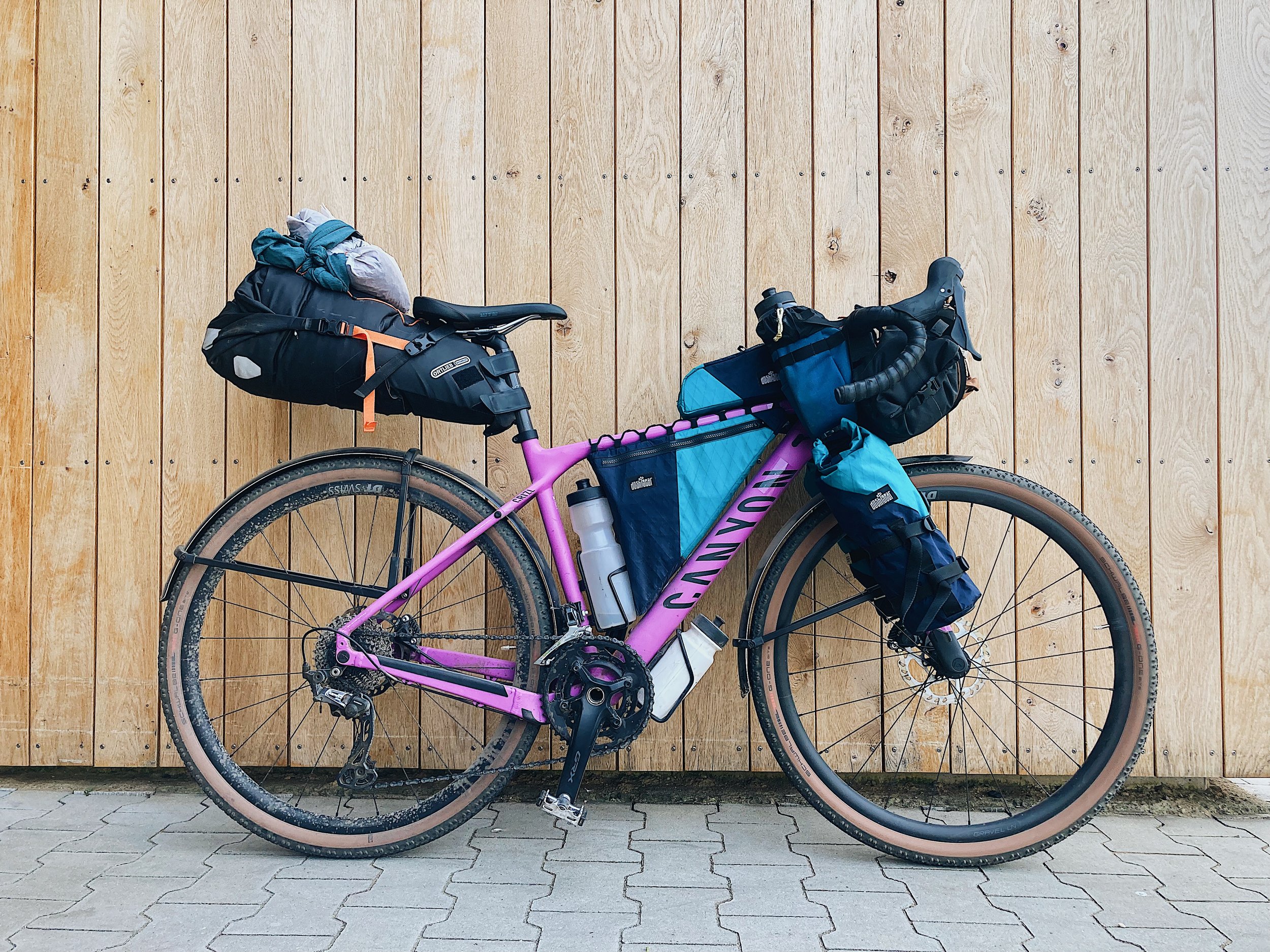 These lightweight fork packs are made to fit on most fork cages, and they can add about 4 liters of volume per bag to your setup. They are a great solution if you need to bring a bit more gear but you don’t want the added weight of a rear rack. I recommend putting soft and lightweight items in these bags like spare clothes, food, a tent or a sleeping bag. Hard items with sharp edges can damage the fabrics when pulled tight to the fork cages.